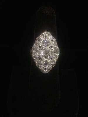 centering a round brilliant and old European-cut diamonds accented with single-cut diamonds in a detailed pierced millegrain mounting; total diamond weight approximately: 2.85 carats.