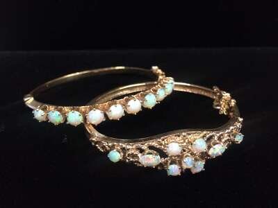 A collection of two opal and fourteen karat gold bangle bracelets
