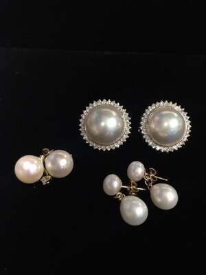 *A collection of six cultured pearl, mabé pearl, diamond and fourteen karat gold earrings