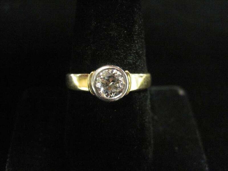 centering a bezel-set round brilliant-cut diamond weighing approximately: 0.85 carat.