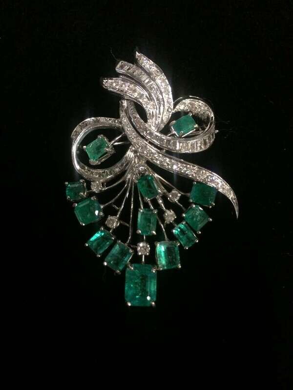 ribbon and spray motif set with step-cut emeralds and accented with single and baguette-cut diamonds; total diamond weight approximately: 2.00 carats.