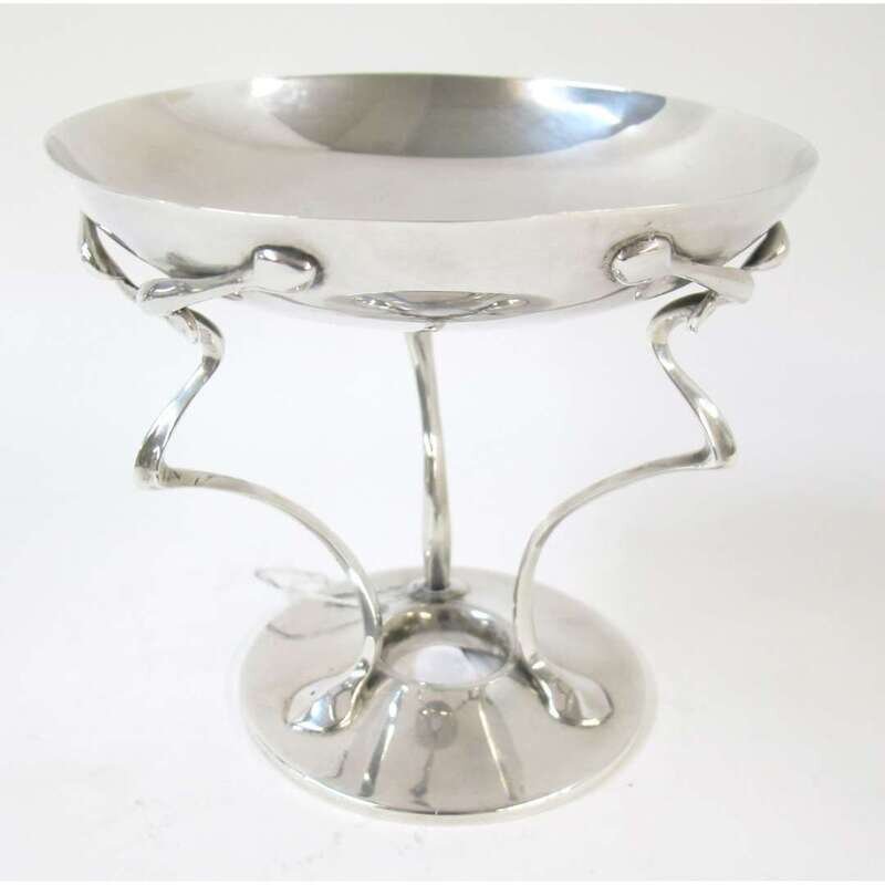 Circular bowl over three stylized legs, the underside engraved "Rd No 437773" and "10901."