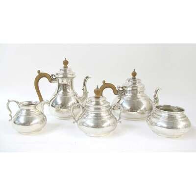 Comprising a coffee and teapot, creamer, covered sugar, and waste bowl, with wooden scroll handle and finials. (5).