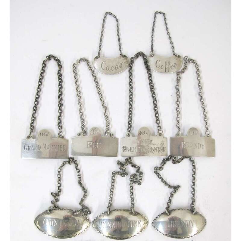 Eleven sterling silver bottle tickets mostly English, 20th century