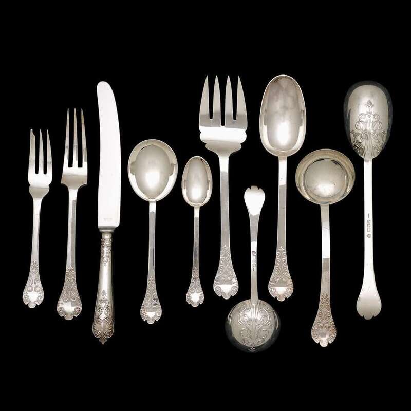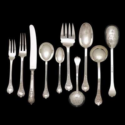 Comprising twelve each dinner knives and forks, salad forks, cream soup spoons; twenty-four teaspoons; two ladles; a salad serving set; and a serving spoon. (77).