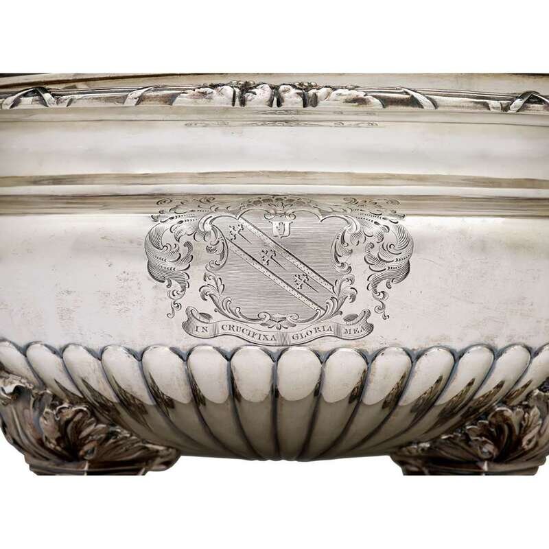 Circular, each on four acanthus leaf and scroll feet, with reeded foliate-capped bracket handles with lion's mask terminals, the lower body and cover gadrooned, engraved with coat-of-arms for Sir Edward Knatchbull, 8th Bt. (1758-1819) above the motto "In Crucifixa Gloria Mea," the covers and liners engraved with leopard passant crest. (2).