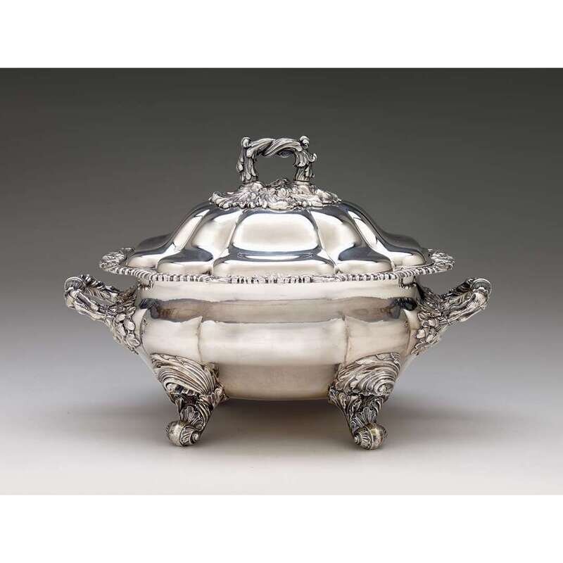 Lobed oval form raised on four acanthus leaf scroll feet, each handle terminating in cluster of acorns amongst foliage, with gadrooned and shell rim, apparently unmarked.