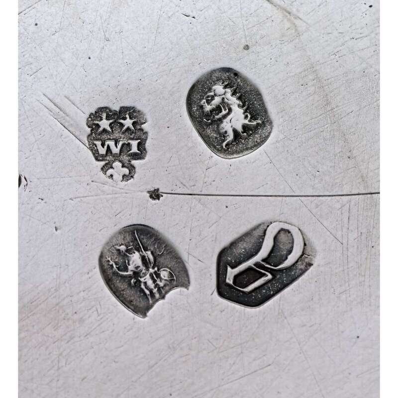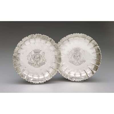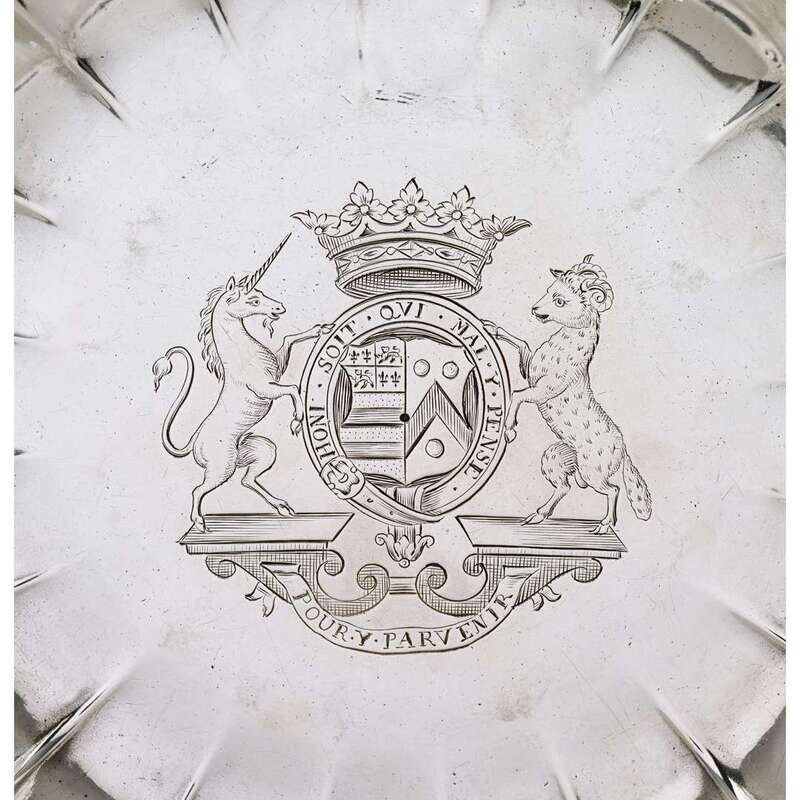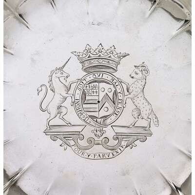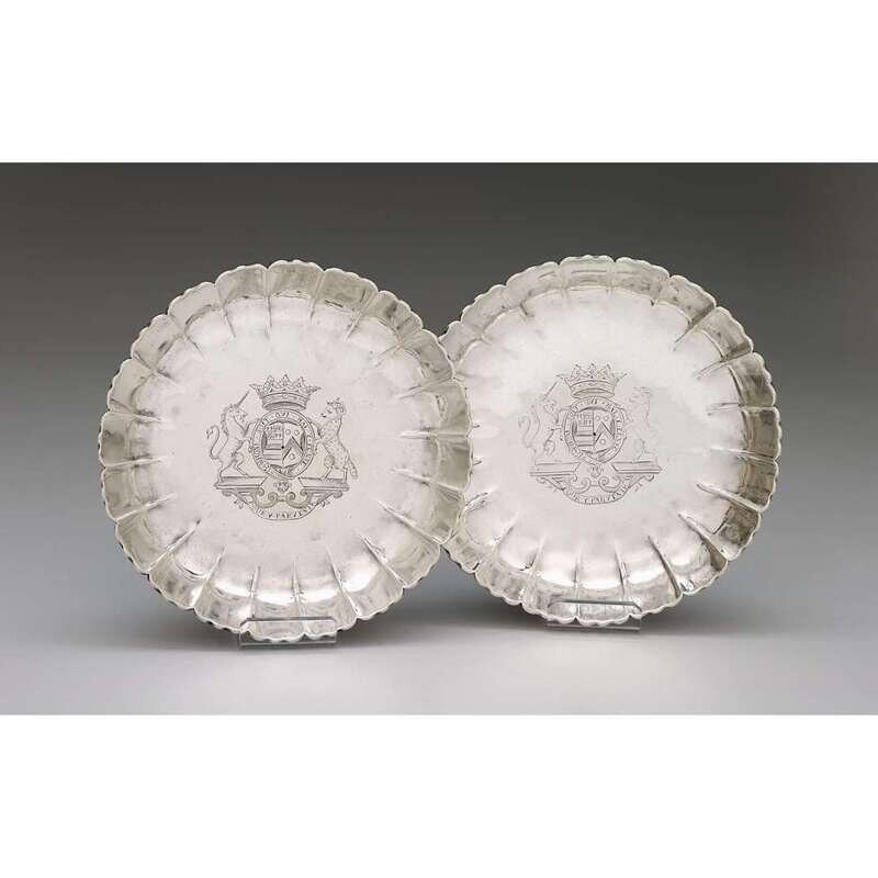 Circular with fluted and scalloped edge, the center engraved with coat-of-arms and supporters below a ducal coronet and above the motto "pour y parvenier," the arms are those of Manners impaling Sherard for John Manners, 2nd Duke of Rutland, and his second wife, Lucy, with scratch number 5-2 to underside. (2).