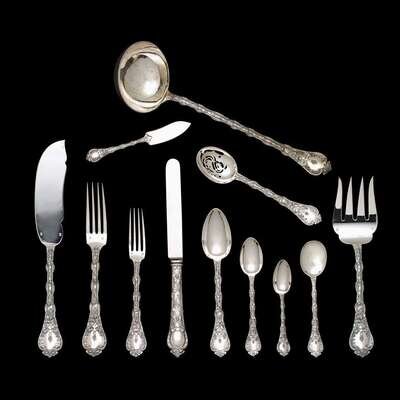 Comprising twelve each dinner forks and knives, butter knives, teaspoons, demitasse spoons, bouillon spoons, pierced spoons; twenty-four each luncheon forks and place spoons; one carving fork and knife; one fish serving fork and knife; one each soup ladle and punch ladle, serving fork; three large serving spoons; two cheese picks. (144).