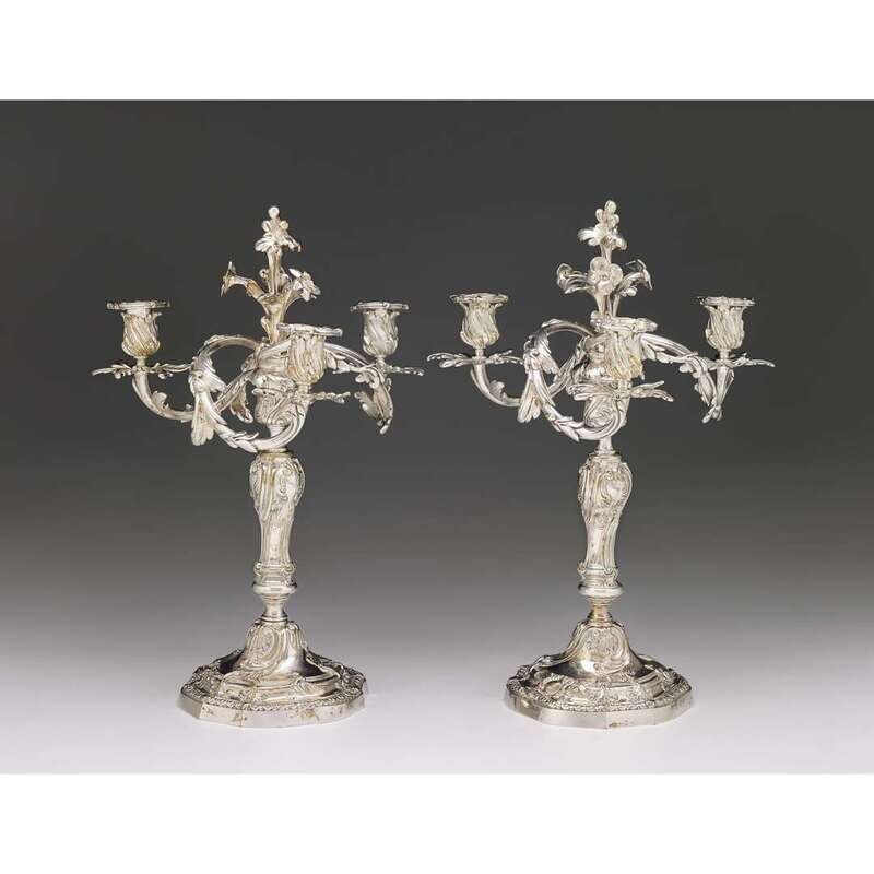 Pair of Louis XV style silver-plated three-light candelabra Eugene Bazart, Paris, late 19th century