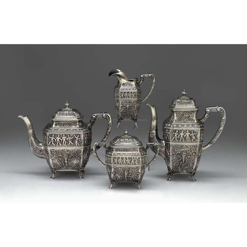 Comprising a coffee and teapot, covered sugar, and creamer, elongated octagonal form repoussé worked throughout with putti playing musical instruments and flowers within C-scrolls and foliage, raised on four feet, .800 standard. (4).