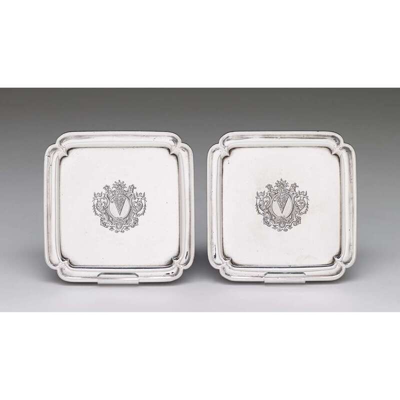 Square form with incurved corners, engraved with crest to center, with scratch number 7=11 to underside. (2).