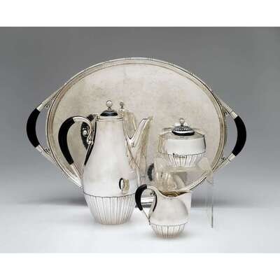 Comprising a coffee pot, creamer, covered sugar, and twin-handled tray, of ovoid form with fluting to lower half and ebony scroll handles. (4).