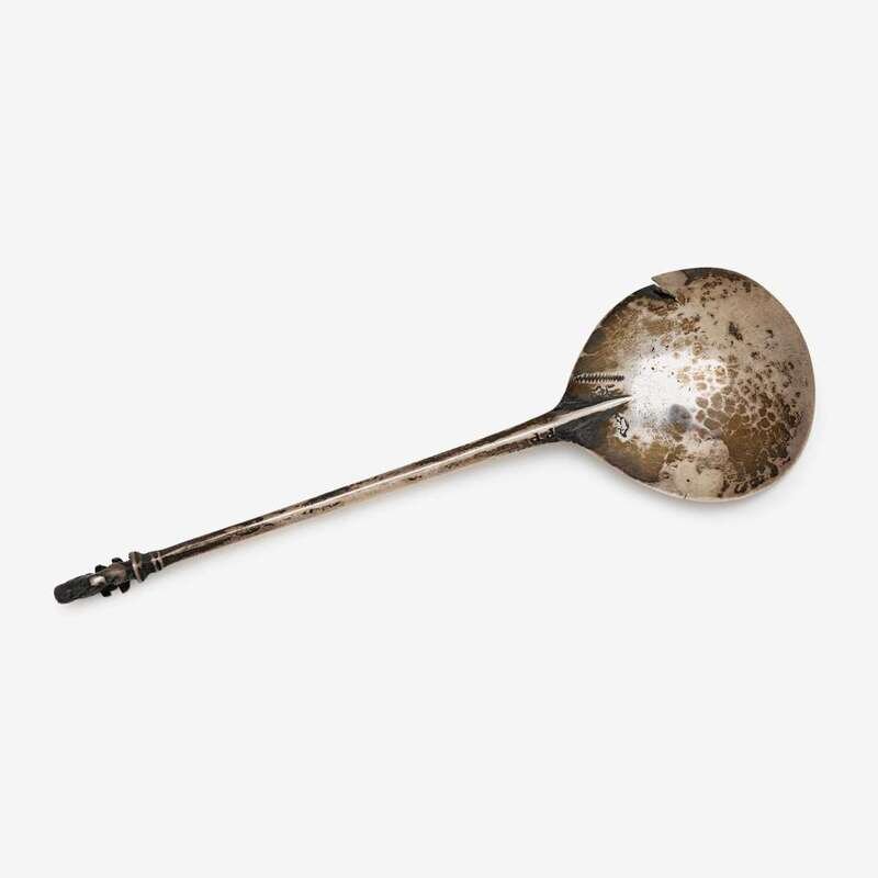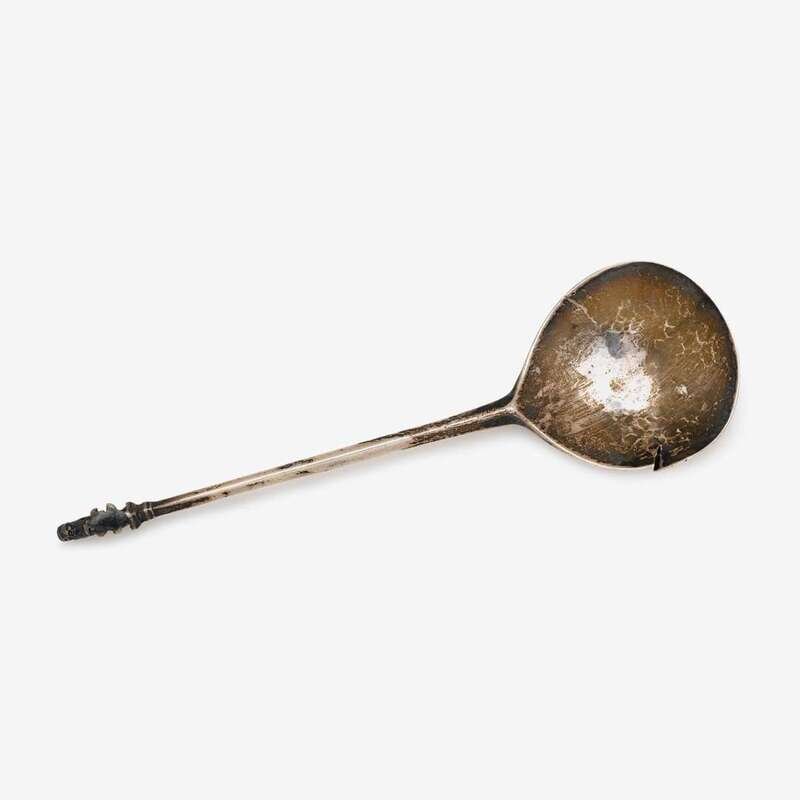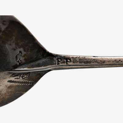 Fig-shaped bowl and tapering square stem with finial cast as a lion sejant, the stem marked "P.P", with Dutch dolphin import mark and three other unidentified marks, and an assay scrape to reverse side of bowl.
