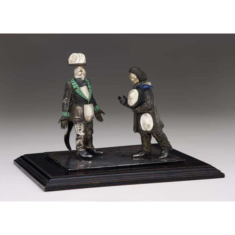 Comprising two standing male figures in formal dress, each with mother-of-pearl face and pearl inset garments, raised on silver base and ebonized wood plinth, apparently unmarked.