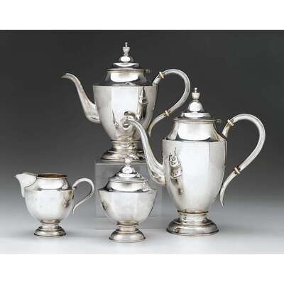 Comprising a coffee and teapot, creamer, and covered sugar, of octagonal tapering form raised on stepped circular foot with hinged domed cover and urn-form finial, underside stamped "950/Silver." (4).