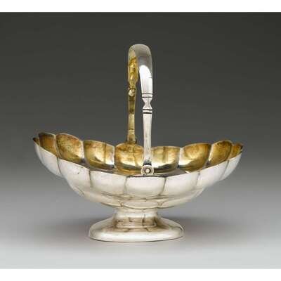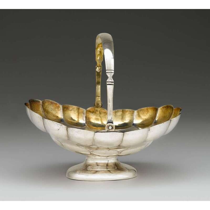 Oval lobed basket raised on pedestal foot with swing handle, with gilt-washed interior, 84 zolotnik.