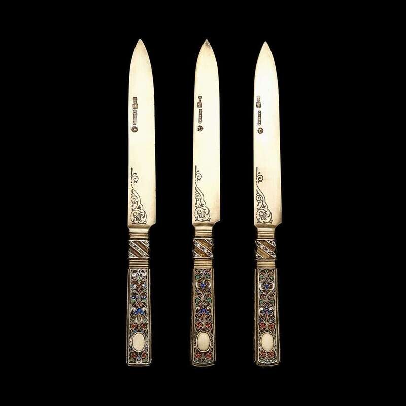 Three Russian silver-gilt and cloisonné enameled knives Pavel Sazikov, St. Petersburg, 1879-80, assaymaster AK