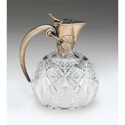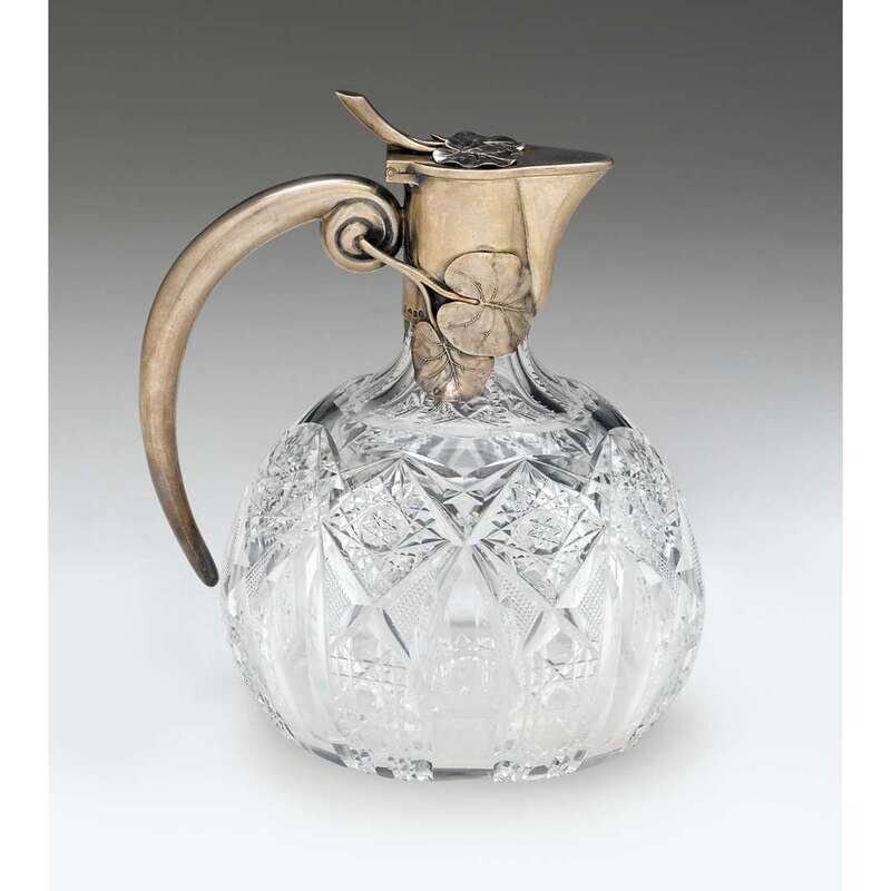 The round cut-glass body with diamond pattern, with silver scroll handle and neck with applied ivy branches and leaves, 84 zolotnik.