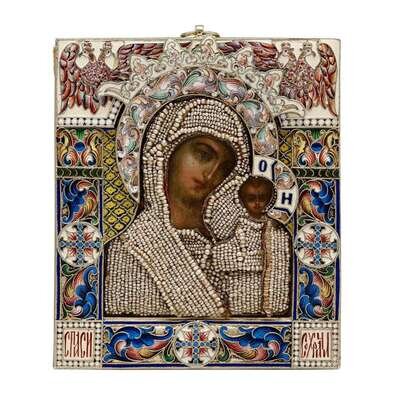 The central figures in seed pearl garments, the cloisonné enameled decorated oklad with heraldic eagles to the upper corners and Cyrillic inscriptions meaning 'Save and preserve' to the lower corners, 84 zolotnik.