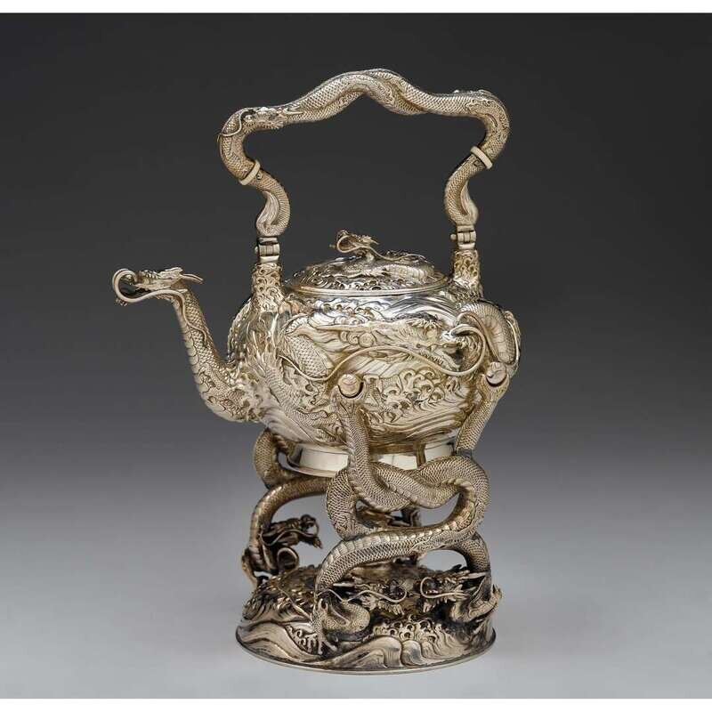 The squat bulbous kettle with high-relief repoussé decoration of dragons emerging from cresting waves, raised on stand formed as intertwined dragon bodies with similar motif, the underside stamped Watanabe and jungin indicating pure silver.