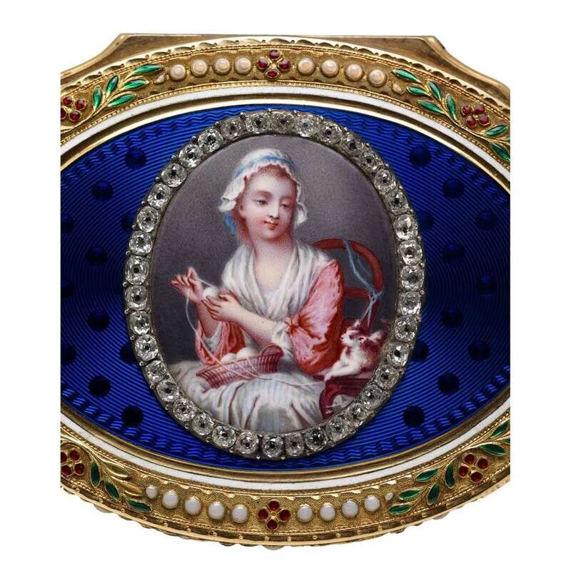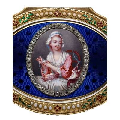 Oval form, the blue guilloché enamel top centered by a plaque finely painted with a genre scene after 'The Wool Winder' by Jean-Baptiste Greuze, within diamond frame, the borders enameled with red and green flowers and leaves interspersed with white jewels, marked to interior.
