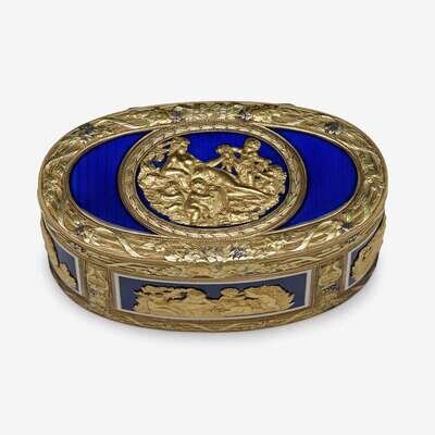 Oval form with chased and engraved gold mounts to cover and sides, the cover depicting the Toilet of Venus, the sides with putti representative of the four seasons on a cobalt enamel ground, with French prestige marks and French and Dutch control marks.
