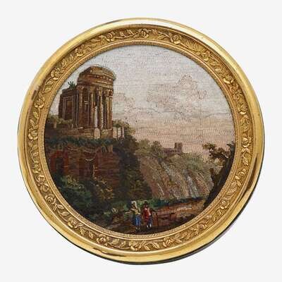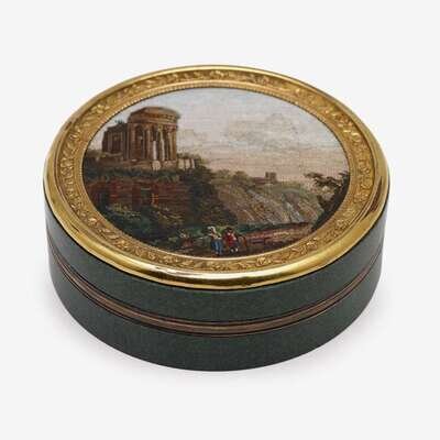 Circular, the cover with view of the Temple of Vesta at Tivoli within a gold rim chased with roses, the outer rim possibly gilt-metal, apparently unmarked.