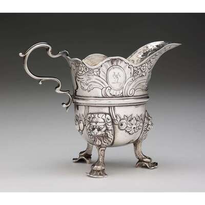 Helmet-form, repoussé-worked and chased with rocaille, floral swags, and scroll motif, raised on three lion mask and shell-form feet, engraved with a crest and initials to underside, marks rubbed.