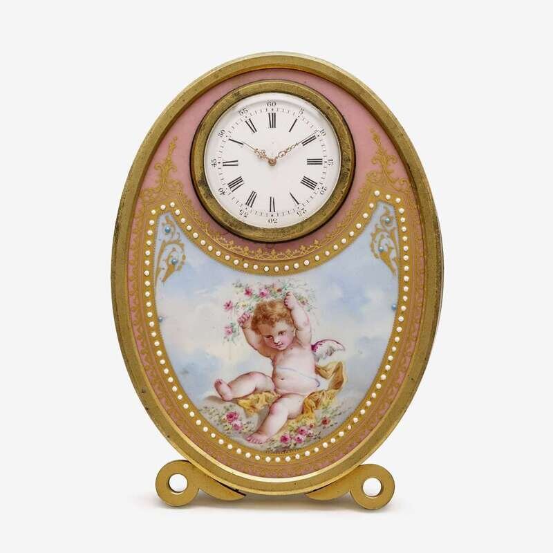 Dial enameled with Roman hours and Arabic hours, set within oval pink ground plaque finely painted with a putti within a jeweled frame, supported on an easel back.