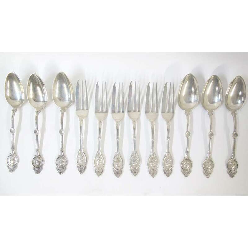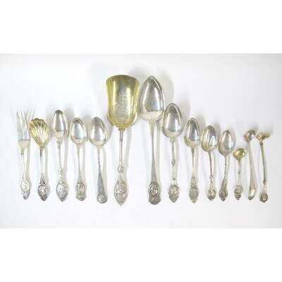 Together with six place spoons in the Medallion pattern, marked "Geo. Finck"; and twelve miscellaneous silver and silver-plated flatware pieces in the Medallion pattern. (24).