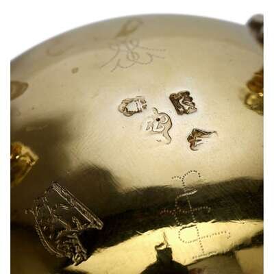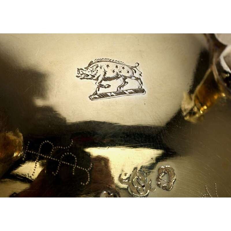 Baluster form decorated with floral and scroll motif with rocaille cartouche centering a bird, raised on three paw feet with leaf-capped double-scroll handle, the underside engraved with family crest of a boar and monogrammed with initials.