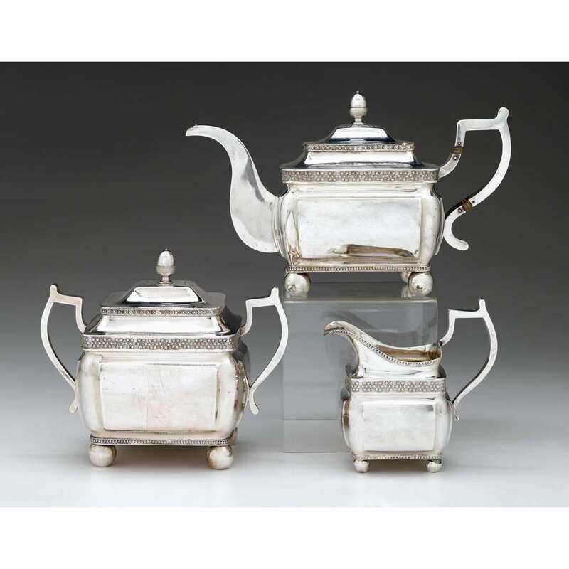 Comprising a coffee pot, covered sugar, and creamer, of rounded rectangular form raised on four ball feet with decorative floral band at shoulder and foot. (3).