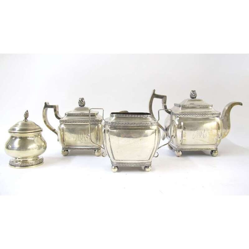 Comprising a coffee and teapot by Christian Wiltberger, together with waste bowl by Joseph Shoemaker, and covered sugar by International Silversmiths in the 'Prelude' pattern. (4).
