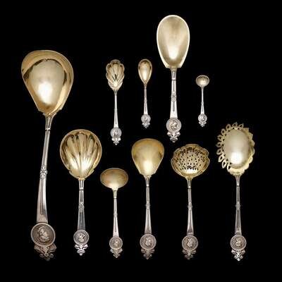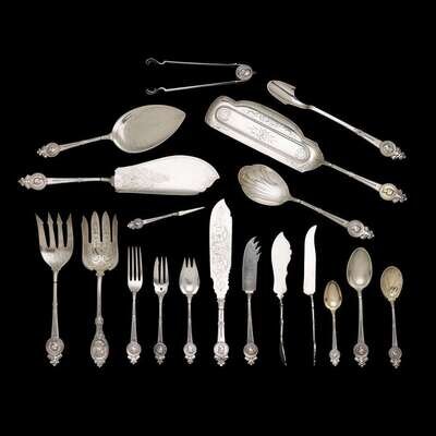 Comprising seven luncheon forks; six each ice cream forks, fruit spoons, and demitasse spoons; two each dessert forks, butter picks, fish slices, fish serving forks; one each place spoon, cheese scoop, serrated cake knife, casserole shell, cake server, pair of sugar nips; three various fish knives; the following with gilt-washed bowls: one each large punch ladle, casserole shell, sugar shell, macaroni server, pierced shell spoon, salt spoon, salt spoon, mustard spoon, serving spoon, and two ladles; with various monograms and retailers including Tiffany & Co. and Starr & Marcus. (approx. 52).