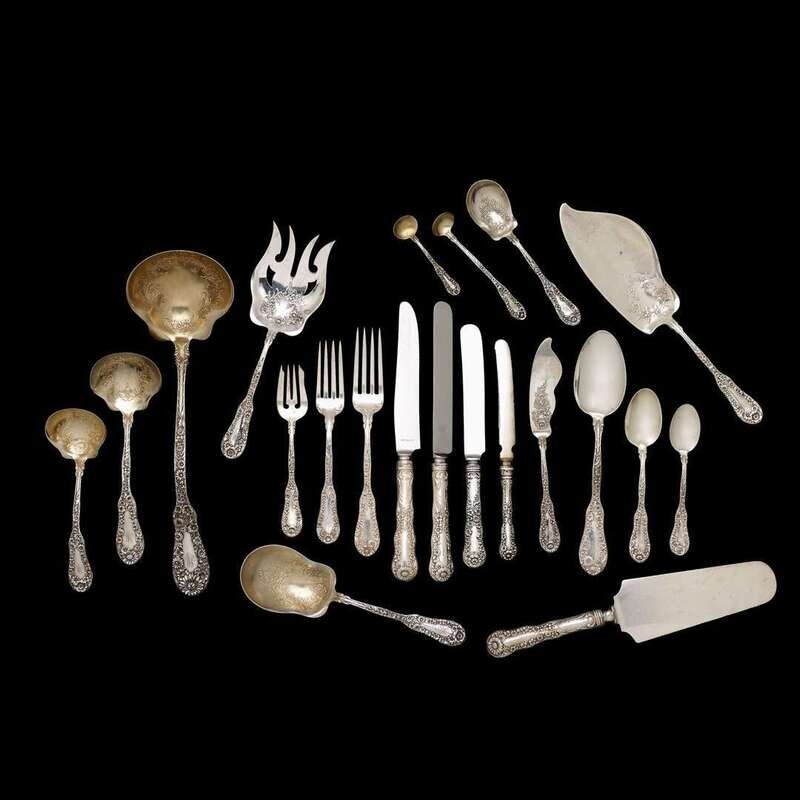 With varying flowerhead terminals, comprising twelve each dinner knives with French blades, dinner forks, tablespoons; eighteen luncheon forks; eight luncheon knives; six each dinner knives with blunt blades and dessert knives; five dessert forks; twenty coffee spoons; thirteen teaspoons in three slightly varying sizes; two each salt spoons and serving spoons; one each cake server, master butter, fish server, cream ladle, gravy ladle, punch ladle, mustard spoon, asparagus server; some serving pieces with incised decoration to bowl or blade, and some gilt-washed; monogrammed; in original wooden chest from Mauser Mfg. Co., the front with engraved plaque "Presented to N Bro Jacob Metz as a Token of Esteem by the German Masonic Temple Association April 5th, 1903." (124).
