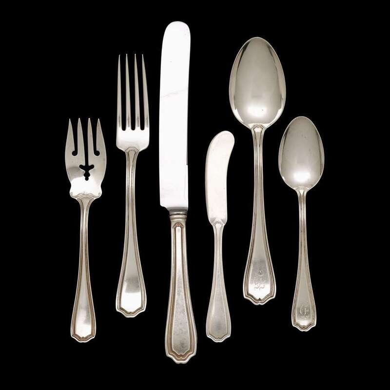 Comprising twelve each dinner knives, forks, place spoons, teaspoons, salad forks; thirteen butter spreaders; some monogrammed. (73).