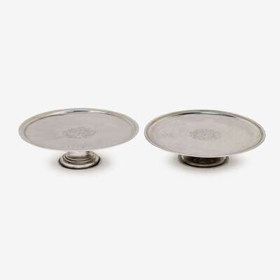 Each circular on pedestal foot, the first Britannia silver by James Smith I, London, 1720-21; the second by Thomas Walker, Dublin, circa 1723, the underside engraved "W W*M" with scratch weight 13-4; each engraved with armorial within scrolling foliate cartouche. (2).