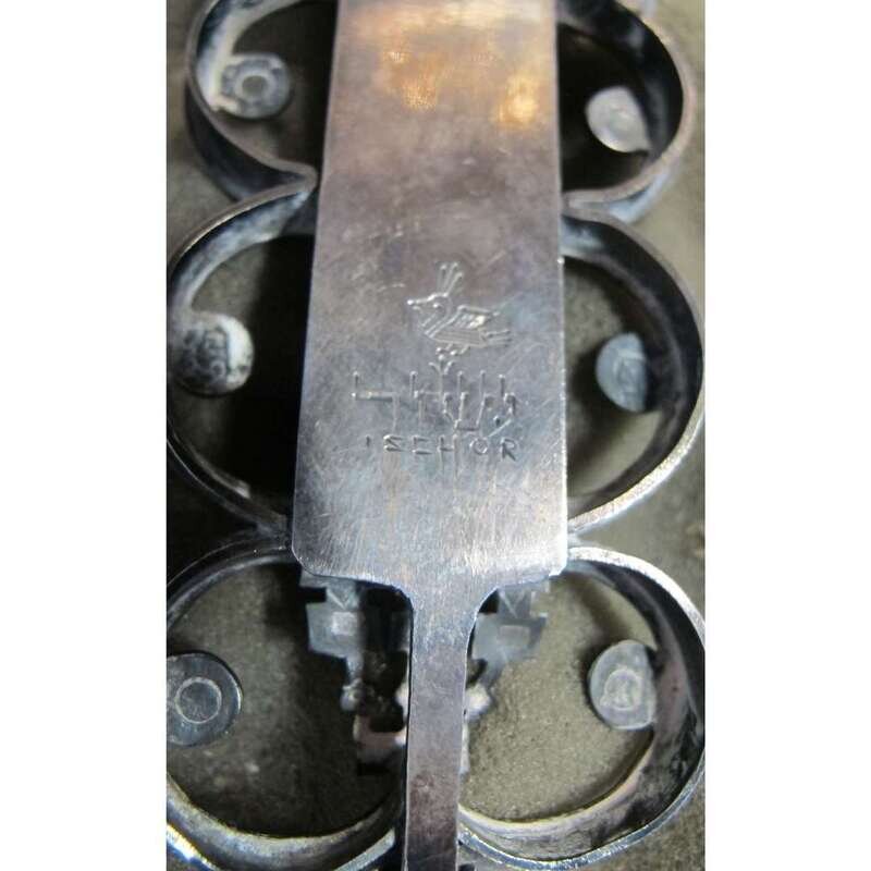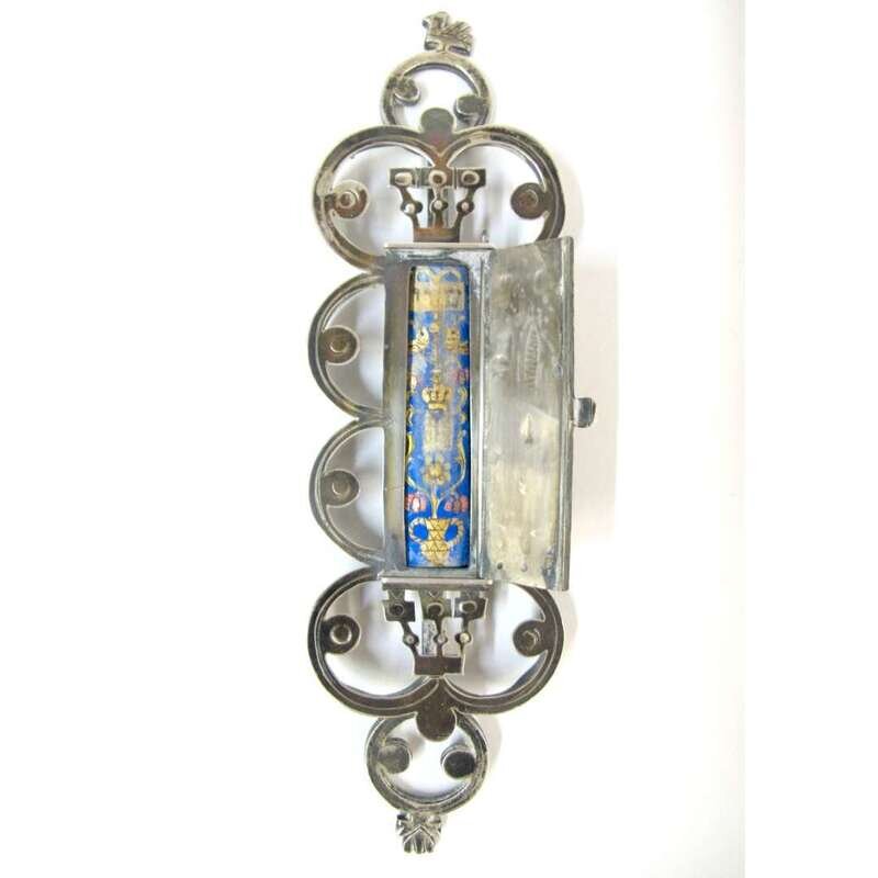 The central rectangular case with stylized depiction of man holding a torah, within four abstract semi-circular elements suspending loose rings, topped by a dove.