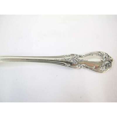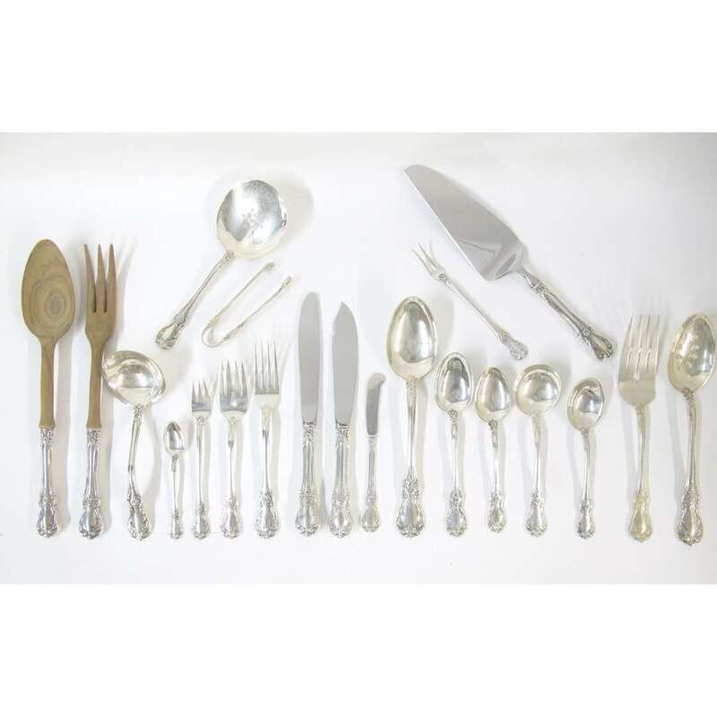 Comprising thirty-six teaspoons; thirty dinner knives; twenty-nine butter spreaders; twenty-seven dinner forks; twenty-four each fish knives and forks, cream soup spoons, cocktail forks, demitasse spoons; six place spoons; four lemon forks; three each tablespoons, ladles, serving forks; two each pierced tablespoons, tomato servers, berry spoons; one each cake server, sugar nips; pair of wooden salad servers with silver handles. (271).