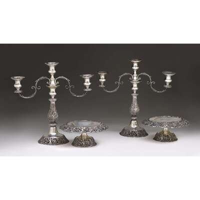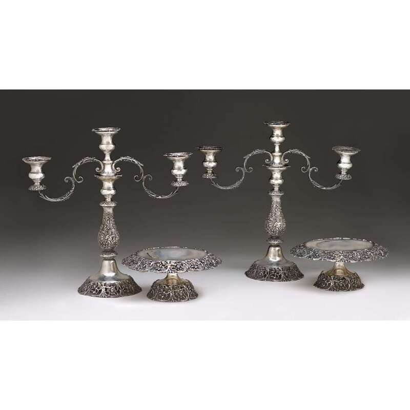 Comprising two compotes and a pair of three-light candelabra, each with openworked figural and lion mask decoration, one compote marked "Sterling for Fina." (4).