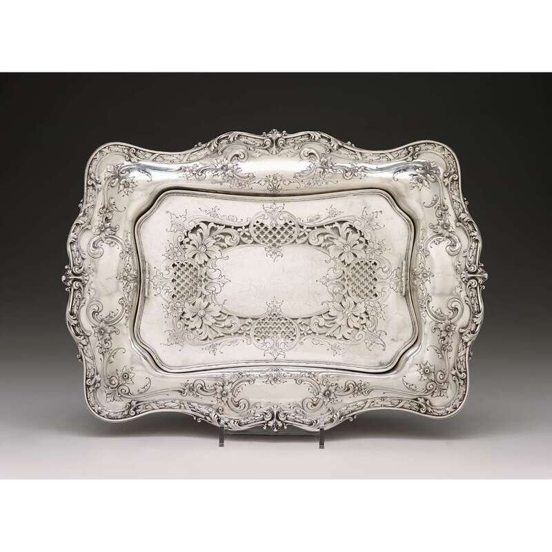Shaped rectangular form, the undulating rim with scroll and florals, with removable pierced strainer, underside marked "Sterling 5924."