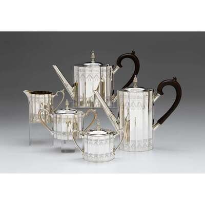 Comprising a coffee and teapot, creamer, covered sugar and an additional silver-plated covered sugar. (5).
