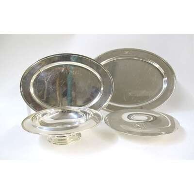 Oval form, the larger with gadrooned border and monogrammed; together with a cake stand by Redlich & Company, monogrammed; and a footed bowl by Watson Company. (4).