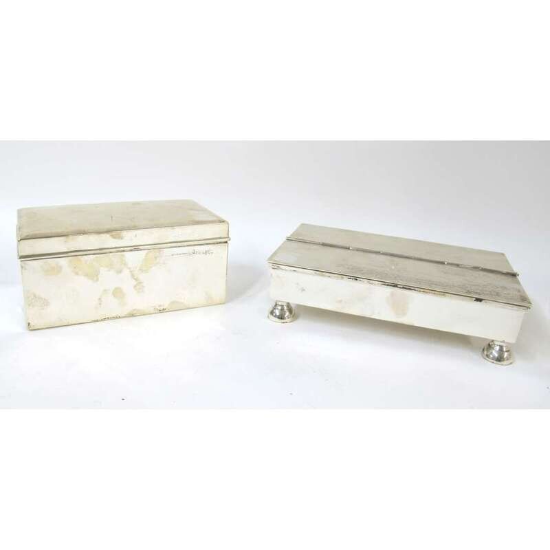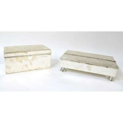 Rectangular double-sided box, one side opening to ink set with two wells, the other a compartment for pens, the cover engraved with family crest and motto "Sans Crainte"; together with a sterling silver box with wood-lined interior. (2).