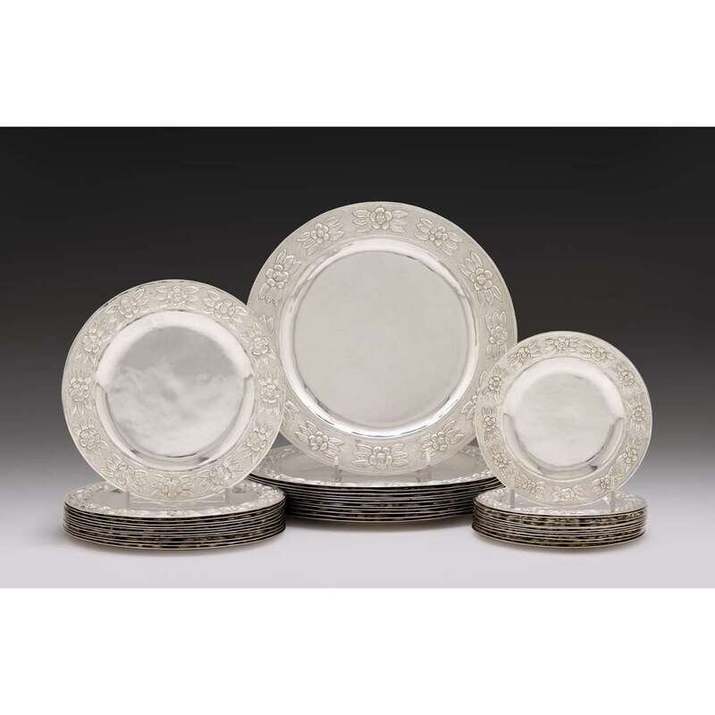 Circular, the rim with band of repoussé and chased roses on a stippled ground in the Spanish Colonial taste, comprising twelve each dinner plates, salad plates, and bread plates (two by J. Vigueras), .900 standard. (36).