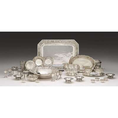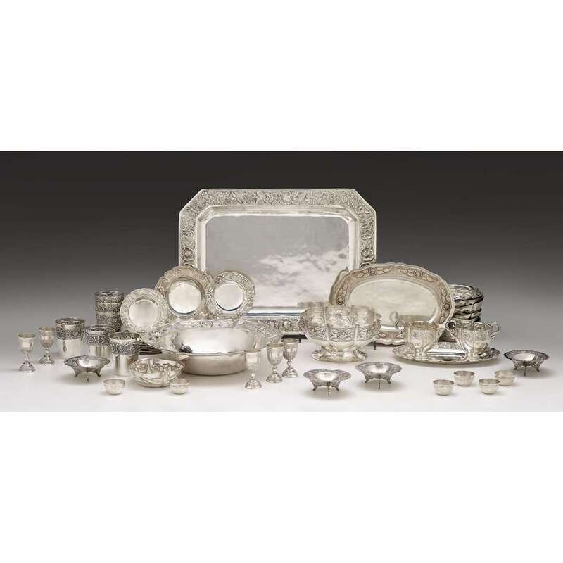 In the 'Aztec Rose' style decorated with repoussé roses in the Spanish Colonial taste, comprising twelve each cordials, footed wastebowls, nut dishes; a creamer, sugar and undertray; one gravy dish with conforming tray; one each small oval tray, shallow dish, and large serving bowl; together with six cups and a large octagonal tray by Plateria I. Vigueras; twelve small dishes by J.Vigueras; nine salts; and six miscellaneous pieces; some .900 standard. (approx. 78).