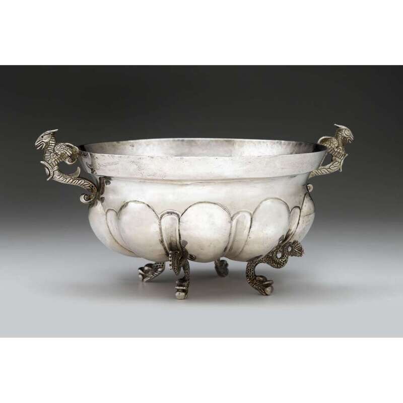 In the Spanish colonial taste, lobed lower half with flared rim raised on four dolphin-form feet with twin stylized handles.