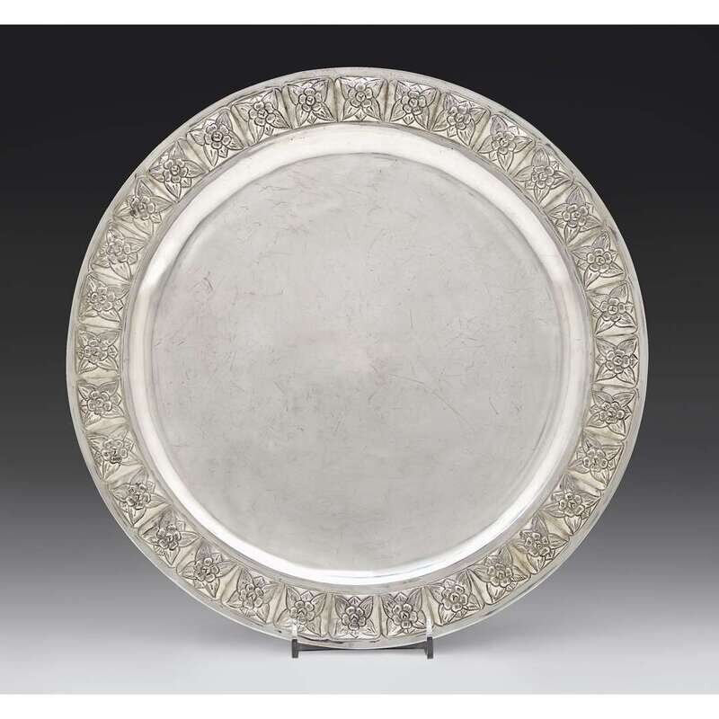Circular, the lobed rim with repoussé flowerheads.