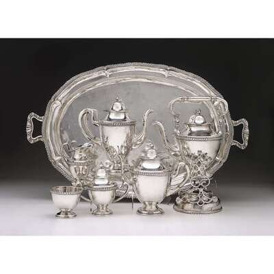 Comprising a hot water kettle, coffee and teapot, creamer, waste bowl, covered sugar, and twin-handled tray, of urn-form raised on circular pedestal foot with applied gadrooned band to shoulder. (7).